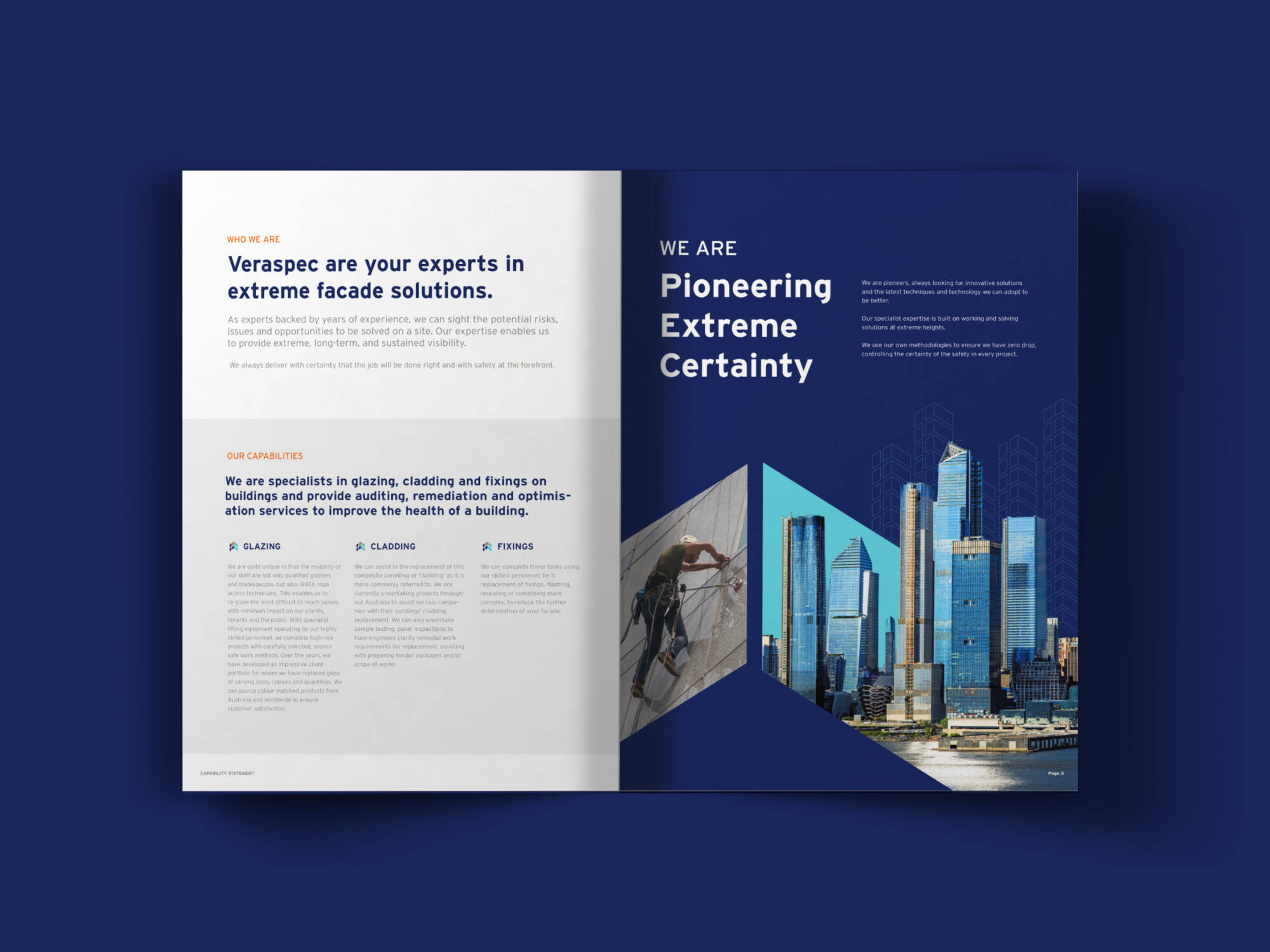 It was crafted to not only be easily articulated by varying stakeholder profiles but also position Veraspec as demanding respect through the considered combination of the words Verify + Specify, Vertical + Aspect, Veritas + Specialists. Working on levels and layers that chime mental associations with strong, positive, industry specific language so that whatever angle you look at it, Veraspec are a brand to look up to.