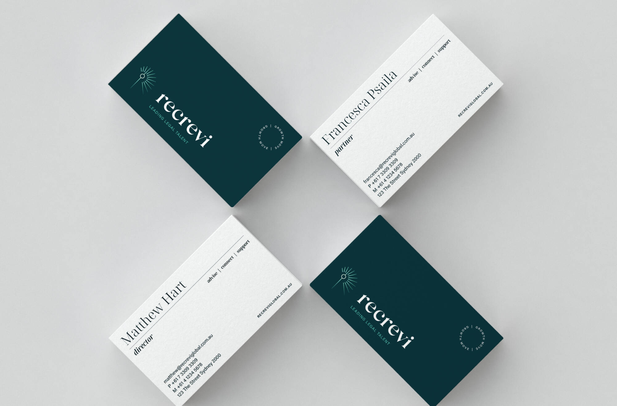 The brand strategy articulates what makes Recrevi different through visual storytelling, brand positioning and campaign language. ‘Leading Legal Talent’ positions them as high-value sophisticated leaders in the legal talent industry. The Recrevi ‘grow again’ story is reflected in the brand promise, growth move, which captures their approach and ability to make a positive and thriving change in careers and businesses. It also acts as meaningful and measurable promise that the team can connect to as standard of performance – have we achieved a growth move for the client or candidate?
