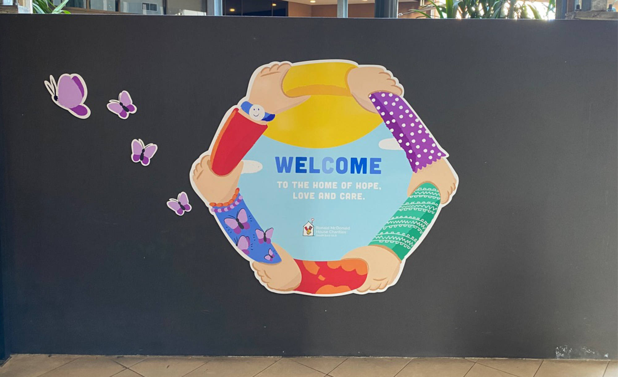 The intent of this private donation mural at the South Brisbane entrance was to encourage people to feel the joy, hope, love and care that you experience inside from the outside.