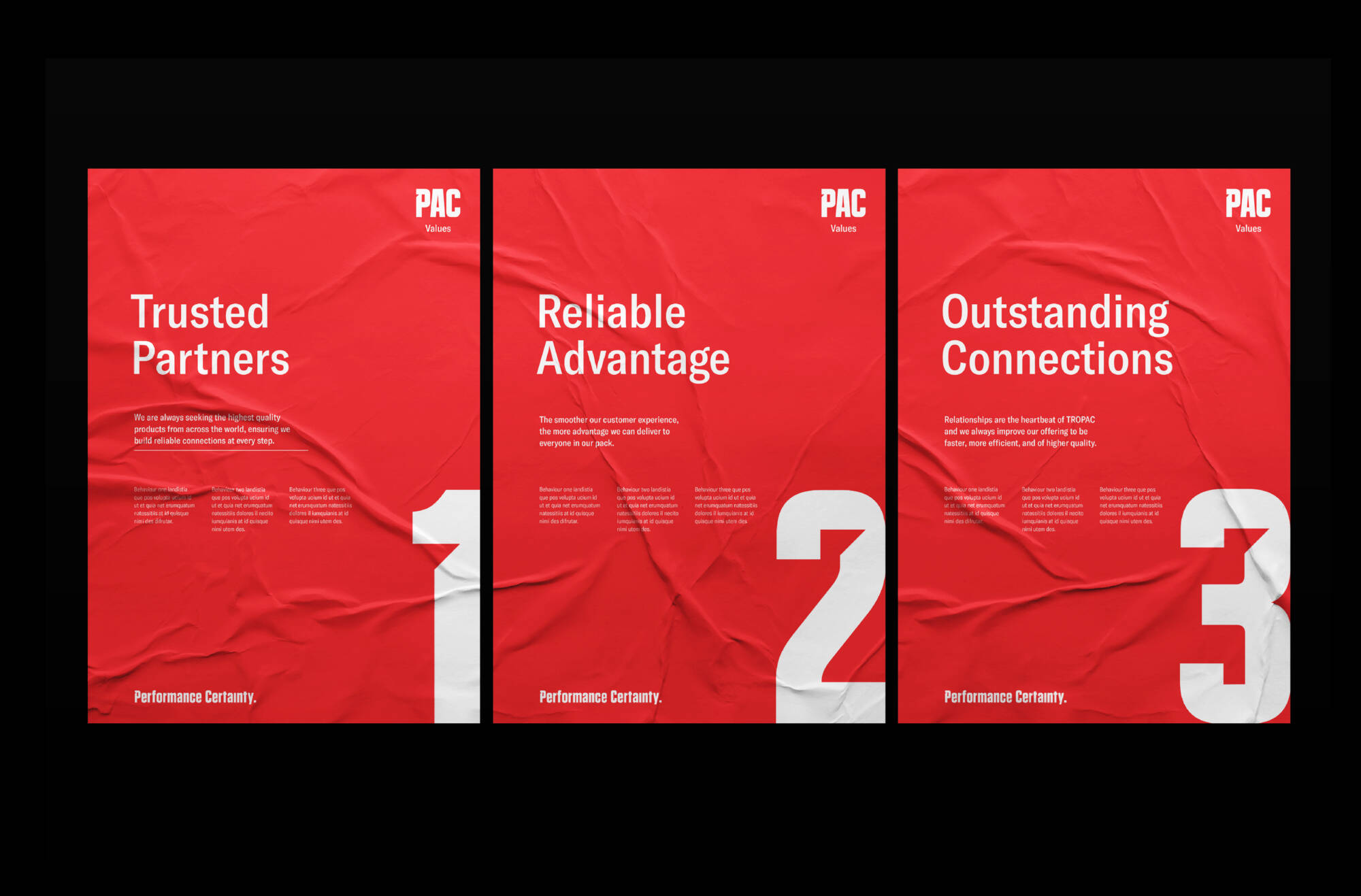 With the brand foundations in place, DAIS led the implementation and internal launch of TROPAC. Employees were introduced to the new brand through a team-wide presentation, supported by brand introduction booklets that brought the story and strategy to life. Posters showcasing the ‘PAC’ values were rolled out to reinforce internal culture and alignment.