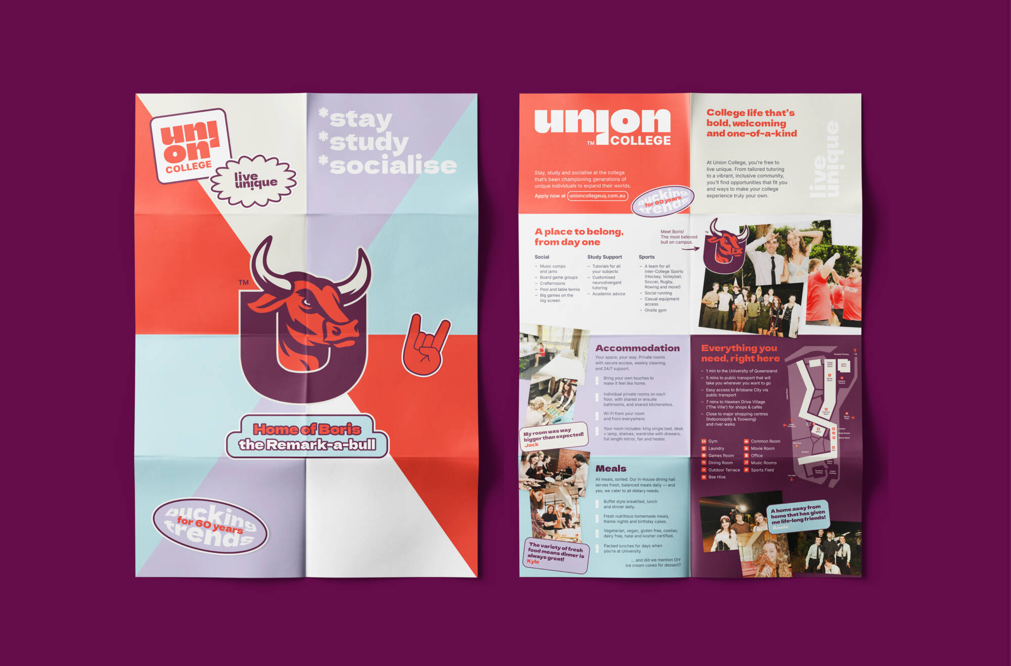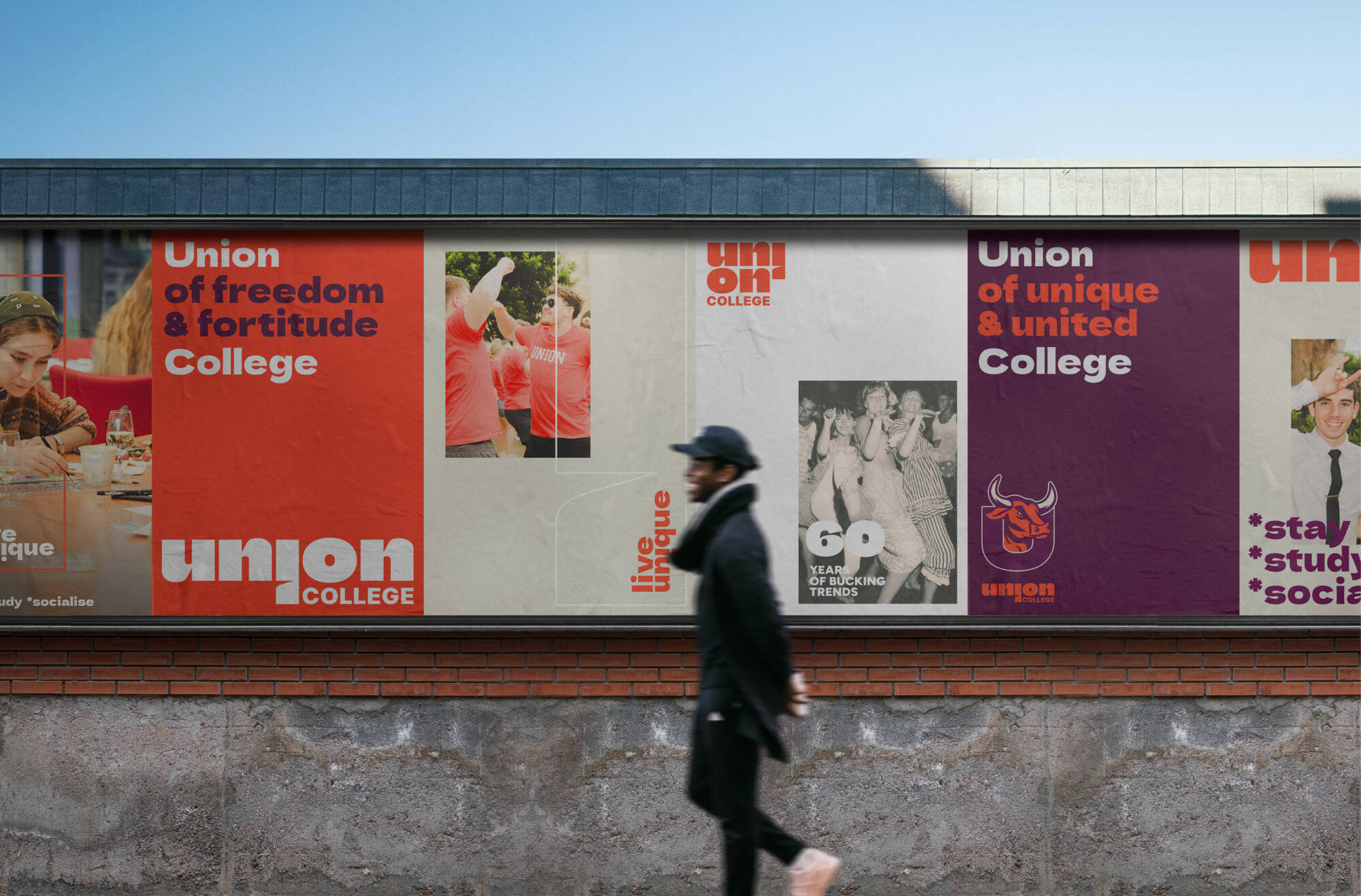 Bringing Union’s brand to life required a voice that was charismatic, curious and open-minded, engaging students, sparking exploration and encouraging personal growth. Content and messaging were crafted to encourage students to engage, explore, and expand their horizons, while celebrating individuality and fostering a sense of belonging. The Live Unique campaign wordmark, adapted from the new identity, works cohesively with the visual system, while Boris the Remark-a-bull, refreshed from the previous mascot, brings a playful, bold and memorable presence embodying bravery and inclusivity. More than a symbol, Boris reinforces Union’s role as a supportive guide, standing alongside students as they live unique journeys and shaping an environment where every individual feels seen, safe and celebrated.