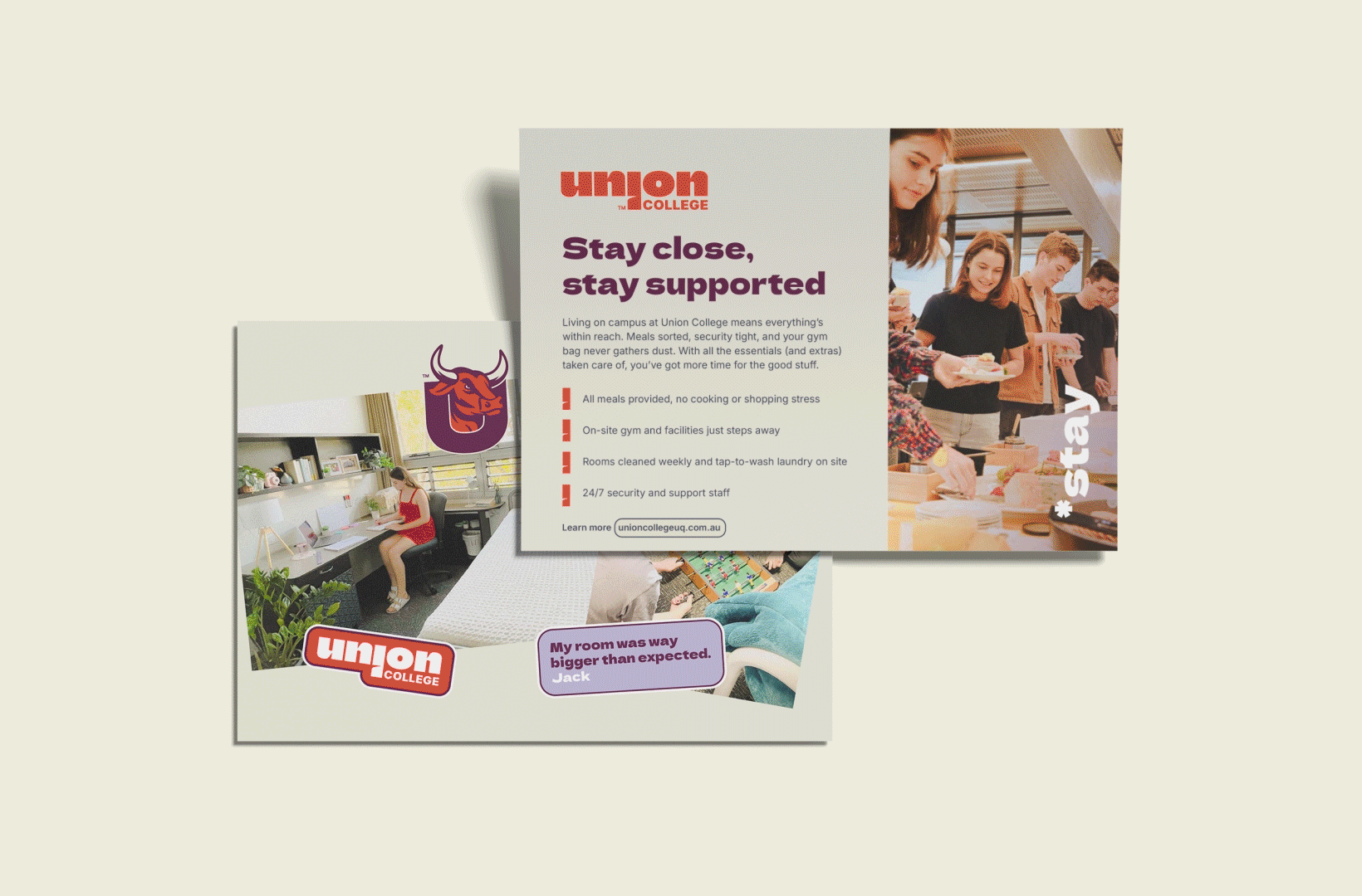 Following stakeholder workshops, leadership interviews, and detailed analysis of the competitor landscape, DAIS uncovered Union’s opportunity to stand apart from alternative accommodation providers. Unlike their competitors, Union’s strength was not just housing students, but shaping experiences where individuality and community thrive side by side. The insight revealed a need for a brand that was engaging, equitable and exciting, bringing to life Union’s philosophy of giving students a safe, supportive place to live and build confidence for the future.
